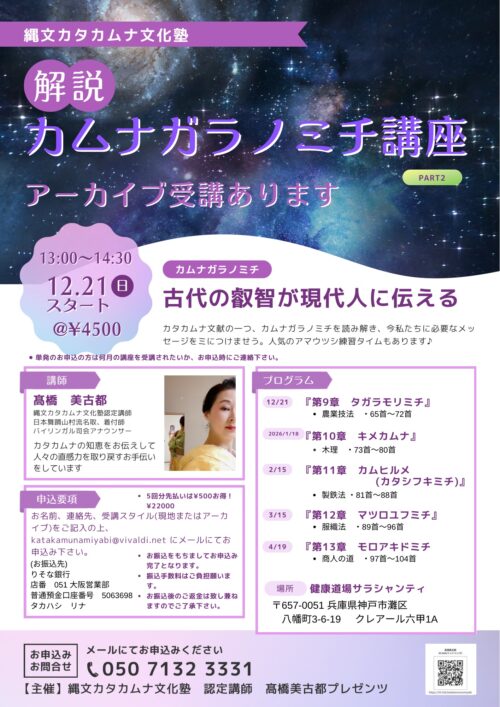 日本舞踊山村流名取。大阪有名連所属阿波踊り踊り子。ジュンアマント主宰の武術天手を通してナンバに通じる2軸の身体意識の大切さを実感。カタカムナの知恵と直感を受け取りやすい身体づくりを広める。司会業という声の仕事を通して日々実感する日本語の響きの大切さ、美しさをカタカムナを通して伝えていきたいと、活動中。バイリンガル。