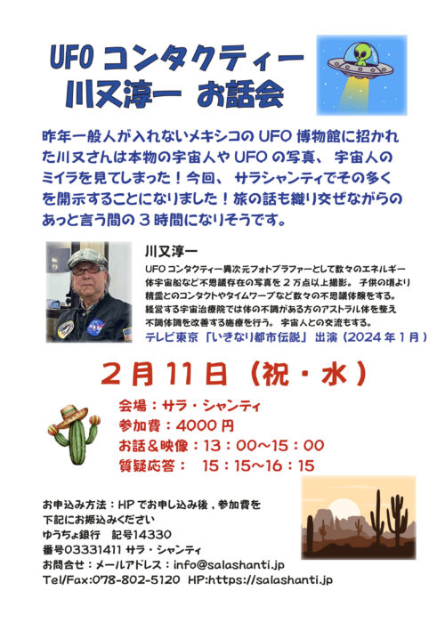 UFOコンテクティー 異次元フォトグラファーとして数々のエネルギー体宇宙船など不思議存在の写真を2万点以上撮影。子供の頃より精霊とのコンタクトやタイムワープなど数々の不思議体験をする。経営する宇宙治療院では体の不調がある方のアストラル体を整え不調体質を改善する施療を行う。宇宙人との交流もする。