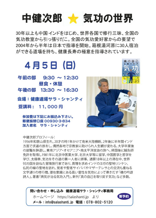 1956年和歌山生まれ。大学在学中から南米大陸横断。その後インド方面の求道の旅をし、偶然各地で宗教家に助けられ人生観を変える。卒業後、就職を辞退し、東南アジア・オセアニア・南太平洋放浪の旅へ。日本の鍼灸師免許を所得後、1981年より北京中医薬大学に留学し、中国医学と哲学を学び、太極拳、気功をその道の第一人者に師事。通算18年以上の滞在中、世界93カ国を訪ね、真理を求めインドのヨガの聖地リシケシ、仏陀の縁の聖地を訪れ、覚者や聖者サイババやマザーテレサとの交流も重ねる。著書「病気が治る気功入門」