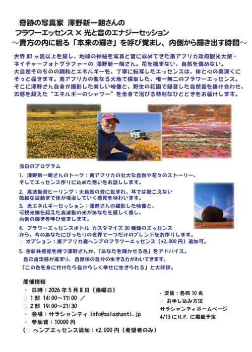 写真は時空を超え、被写体と人・空間をつなぐエネルギーの出口であり、入口だと感じています。自分はその透明なパイプ役になり、一瞬のいのちの輝きを写し撮り伝え、観る人・飾る空間に本来の愛と調和をもたらすことを共通のテーマにしています。見えない一人一人の心がこの3次元の世界を創造し、また破壊もしていると俯瞰する時、真のアートとはなんだろうか?と、熟慮しています。大自然の一部として一人ひとりが、”今”生かされていることの素晴らしさや勇気を喚起させるものを創り続けていきたいと願っています。