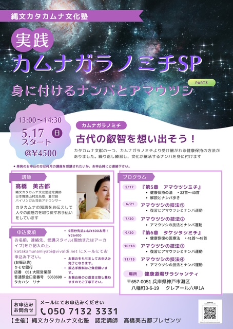 日本舞踊山村流名取。大阪有名連所属阿波踊り踊り子。ジュンアマント主宰の武術天手を通してナンバに通じる2軸の身体意識の大切さを実感。カタカムナの知恵と直感を受け取りやすい身体づくりを広める。司会業という声の仕事を通して日々実感する日本語の響きの大切さ、美しさをカタカムナを通して伝えていきたいと、活動中。バイリンガル。